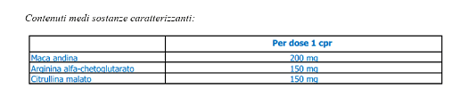 Agenti di carica: cellulosa microcristallina, fosfato dicalcico; maca andina (lepidium meyenii walp.) radice estratto secco, L-arginina alfa-chetoglutarato, L-citrullina, DL-malato; agenti antiagglomeranti: mono e digliceridi degli acidi grassi, sali di magnesio degli acidi grassi, biossido di silicio; agenti di rivestimento: idrossipropilmetilcellulosa, talco, polietilenglicole; coloranti: biossido di titanio, indigotina.