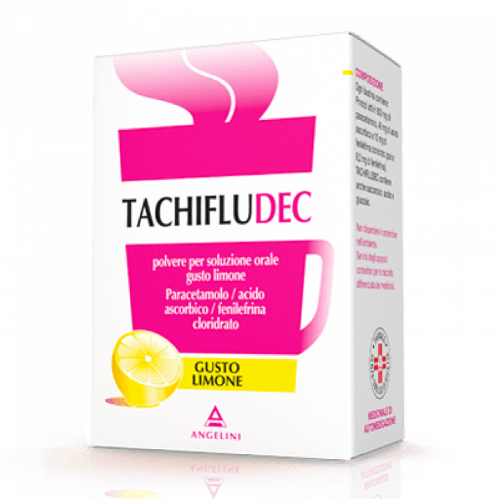 Durante il trattamento con paracetamolo, prima di assumere qualsiasi altro farmaco controllare che non contenga lo stesso principio attivo, poiché se il paracetamolo è assunto in dosi elevate si possono verificare gravi reazioni avverse. Invitare il paziente a contattare il medico prima di associare qualsiasi altro farmaco (vedere anche la sezione 4.5). È sconsigliato l’uso del prodotto se il paziente è in trattamento con antiinfiammatori. Non somministrare per oltre 3 giorni consecutivi senza consultare il medico. Tachifludec gusto limone contiene 4,9 mmoli (112,9 mg) di sodio per bustina; Tachifludec gusto limone e miele contiene 5,9 mmoli (135,8 mg) di sodio per bustina: da tenere in considerazione in persone con ridotta funzionalità renale o che seguano una dieta a basso contenuto di sodio. Tachifludec contiene saccarosio: i pazienti affetti da rari problemi ereditari di intolleranza al fruttosio, da malassorbimento di glucosio-galattosio o da insufficienza di sucrasi-isomaltasi non devono assumere questo medicinale. Tachifludec gusto limone contiene glucosio: i pazienti affetti da rari problemi di malassorbimento di glucosio-galattosio, non devono assumere questo medicinale.