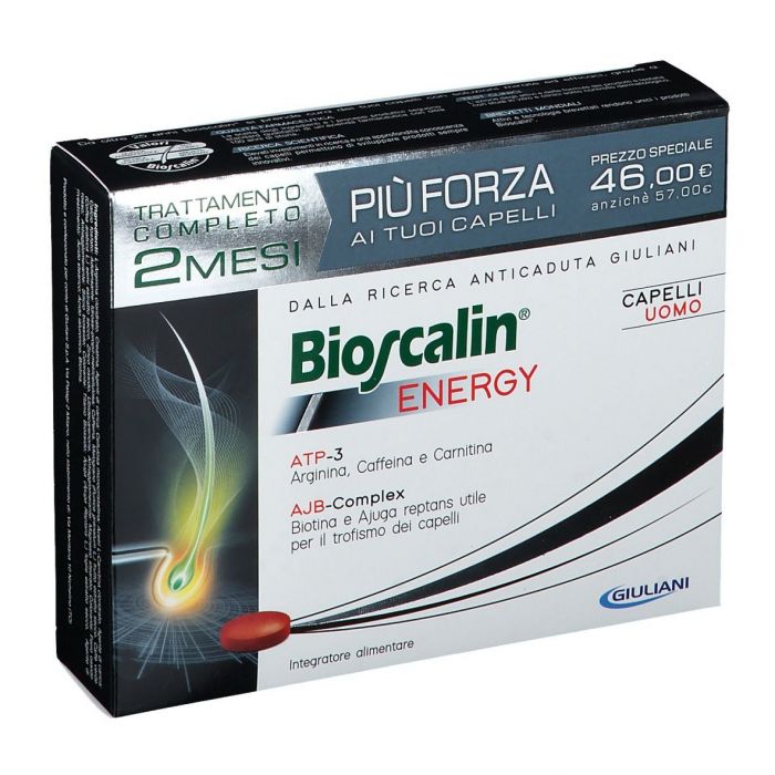 Integratore alimentare utile per i capelli dell'uomo, che associa l'azione combinata dei due esclusivi complessi ATP- 3 e AJB-Complex, alla tecnologia brevettata R-Plus, in grado di veicolare in modo ottimale tutti gli attivi e massimizzare l'assorbimento, potenziandone l'azione sul capello. Frutto della Ricerca Anticaduta Giuliani, l'esclusivo complesso brevettato ATP-3 associa tre attivi: Arginina, Caffeina e Carnitina, implicati nei processi del metabolismo energetico cellulare. L'AJB-Complex combina la Biotina, vitamina che contribuisce al mantenimento di capelli normali, agli estratti selezionati di Ajuga reptans (pianta europea) utili per il trofismo dei capelli. Contiene Ubidecarenone, Creatina e Zinco, nutriente utile per i capelli. La presenza degli estratti di Melograno e Caffè verde contribuisce a proteggere le cellule dallo stress ossidativo. Grazie alla tecnologia R-Plus Bioscalin ottimizza la disponibilità degli attivi sul bulbo, centro vitale del capello. Lo speciale rivestimento della compressa, che la protegge dai succhi gastrici, abbinato al rilascio graduale, permette agli attivi di arrivare integri nell'intestino, dove inizia la loro assimilazione in modo graduale. Il risultato è la massimizzazione della disponibilità degli attivi e un ottimale assorbimento, per una loro efficace azione sul capello.