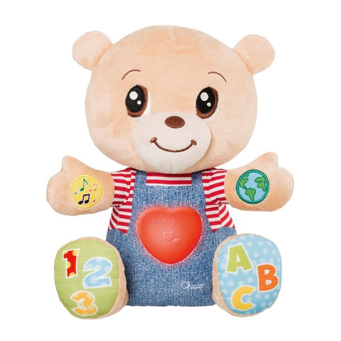 Peluche educativo bilingue che aiuta a sviluppare le capacità cognitive, insegna le prime lettere e i numeri grazie al suo cuore che cambia colore. Grazie a Teddy, il bambino impara a riconoscere ed esprimere le emozioni.