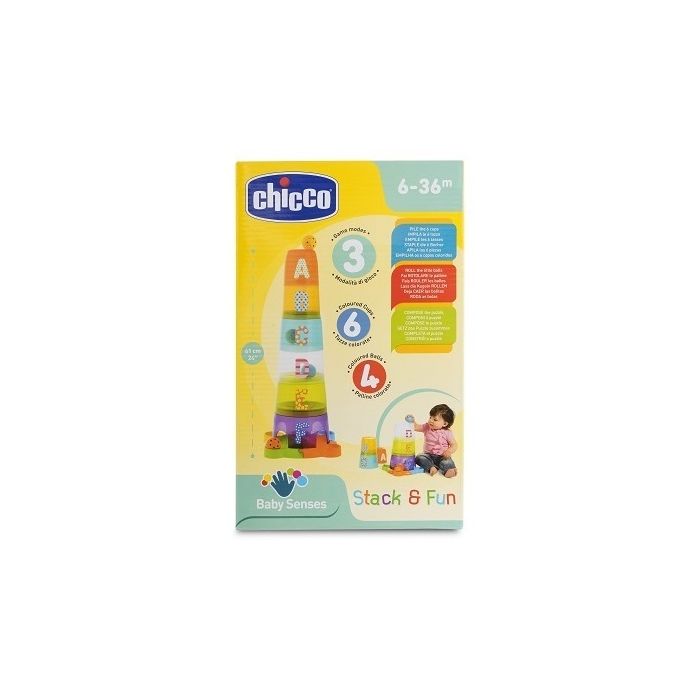 Base puzzle di 4 pezzi, per stimolare la capacità di associazione e imparare i colori, sei tazze colorate impilabili di varie dimensioni, per imparare l'alfabeto con le prime lettere stampate su ogni tazza, 4 palline colorate da inserire nella torre e far rotolare.
