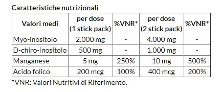 Integratore alimentare a base di myo-inositolo, D-chiro-inositolo, manganese e acido folico. Con edulcoranti. Tecnologia FAST SLOW. Ingredienti Myo-inositolo, D-chiro-inositolo (da Ceratonia siliqua L., fructus) polvere, agenti antiagglomeranti: acidi grassi, biossido di silicio, sali di magnesio degli acidi grassi, talco; edulcoranti: sucralosio, neoesperidina DC; aromi, manganese solfato, acido folico (acido pteroil-monoglutammico).