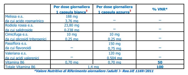 La capsula bianca contiene Melissa che favorisce il rilassamento e il benessere mentale e Rodiola che contribuisce al normale tono dell’umore. La capsula azzurra contiene Passiflora e Valeriana che favoriscono il rilassamento particolarmente in caso di stress. Entrambe le capsule contengono Cimicifuga che aiuta a contrastare i disturbi della menopausa (vampate di calore, sbalzi d’umore, ansia e irritabilità) e Vitamina B6, che contribuisce alla riduzione della stanchezza, dell’affaticamento e alla regolazione dell’attività ormonale.