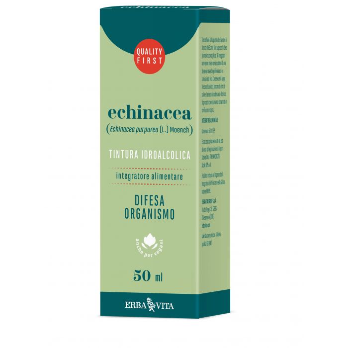 Tintura idroalcolica di Echinacea. Le Tinture idroalcoliche di Erba Vita sono estratti liquidi in rapporto D/E=1/10, ottenuti tramite macerazione a temperatura ambiente delle parti di pianta responsabili dell'attività fisiologica. Dopo una raccolta attenta e rispettosa dell'ambiente, la droga viene immediatamente lavorata, per garantire una duratura conservazione dei componenti attivi. Le Tinture idroalcoliche sono realizzate utilizzando alcol etilico ad appropriata concentrazione, non modificato geneticamente, ottenuto per fermentazione naturale di materie prime vegetali di origine comunitaria. La lunga esperienza nel settore erboristico assicura una metodica di lavorazione standardizzata, per un risultato riproducibile e soddisfacente.