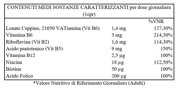 Le vitamine B1, B2, acido pantotenico, B6, B12 insieme alla niacina e alla biotina contribuiscono al supporto del normale metabolismo energetico.