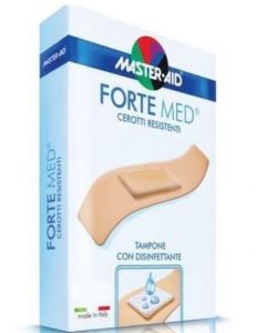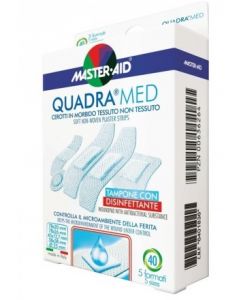 Medicazione traspirante in tessuto non tessuto, dotata di un tampone assorbente con sostanza disinfettante (clorexidina digluconato 0,5%).