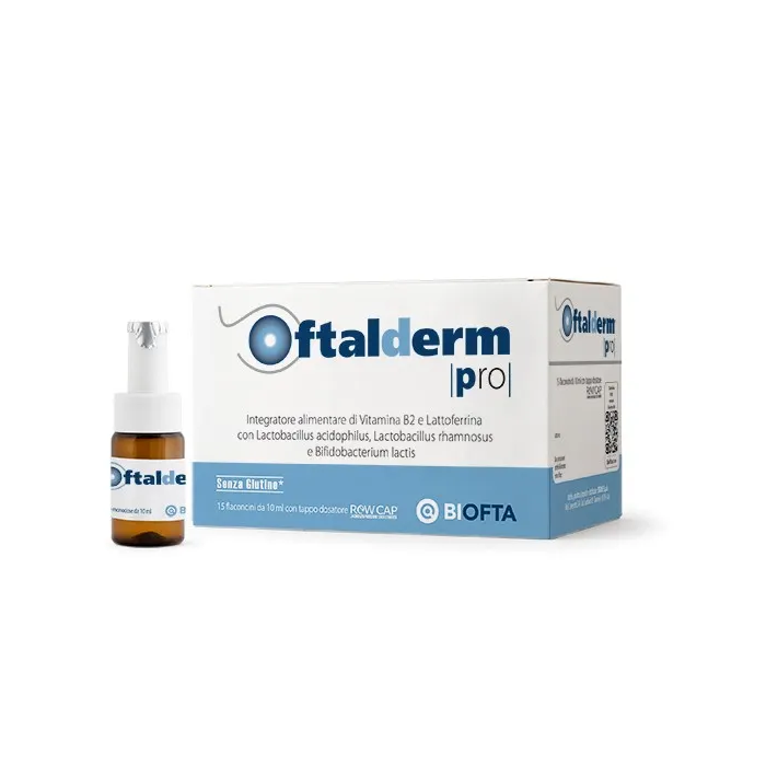 Oftalderm® PRO è un integratore alimentare di Vitamina B2 e Lattoferrina, con Lactobacillus acidophilus DDS-1, Lactobacillus rhamnosus GG e Bifidobacterium lactis UABla-12