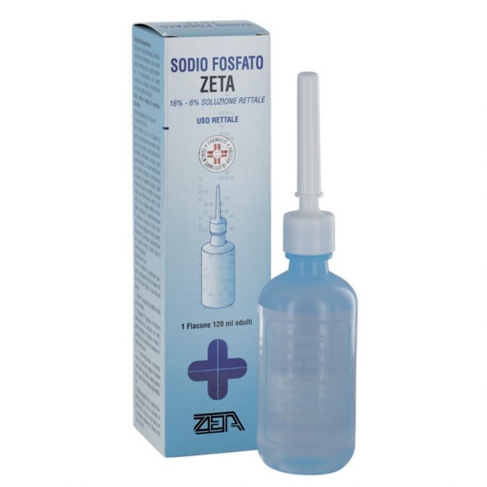 Popolazione pediatrica Il flacone da 120 ml non deve essere utilizzato nei bambini di età inferiore a 12 anni. L’abuso di lassativi (uso frequente o prolungato o con dosi eccessive) può causare diarrea persistente con conseguente perdita di acqua, sali minerali (specialmente potassio) e altri fattori nutritivi essenziali. Nei casi più gravi è possibile l’insorgenza di disidratazione o ipopotassiemia la quale può determinare disfunzioni cardiache o neuromuscolari, specialmente in caso di contemporaneo trattamento con glicosidi cardiaci, diuretici o corticosteroidi. I pazienti devono essere incoraggiati a bere liquidi per aiutare a prevenire la disidratazione, in particolare i pazienti con condizioni che possono predisporre a disidratazione, o quelli che assumono medicinali che possono diminuire la velocità di filtrazione glomerulare, come i diuretici, gli inibitori dell’enzima di conversione dell’angiotensina (ACE inibitori), i bloccanti del recettore dell’angiotensina (sartani) o gli anti–infiammatori non steroidei (FANS). Dato che Sodio fosfato Zeta contiene fosfati di sodio, vi è il rischio di elevati livelli sierici di sodio e fosfato e diminuzione dei livelli di calcio e potassio, e di conseguenza ipernatriemia, iperfosfatemia, ipocalcemia e ipopotassiemia, che si possono verificare con segni clinici come tetania e insufficienza renale. L’abuso di lassativi può causare dipendenza (e, quindi, possibile necessità di aumentare progressivamente il dosaggio), stitichezza cronica e perdita delle normali funzioni intestinali (atonia intestinale). L’uso ripetuto di lassativi può dare origine ad assuefazione o danni di diverso tipo. L’impiego prolungato di un lassativo per il trattamento della stipsi è sconsigliato. Il trattamento farmacologico della stipsi deve essere considerato un adiuvante al trattamento igienico–dietetico (es. incremento di fibre vegetali e di liquidi nell’alimentazione, attività fisica e rieducazione della motilità intestinale). Il trattamento della stitichezza cronica o ricorrente richiede sempre l’intervento del medico per la diagnosi, la prescrizione dei farmaci e la sorveglianza nel corso della terapia. Un’attenta valutazione del medico è indispensabile quando la necessità del lassativo deriva da un improvviso cambiamento delle precedenti abitudini intestinali (frequenza e caratteristiche delle evacuazioni) che duri da più di due settimane o quando l’uso del lassativo non riesce a produrre effetti. È opportuno che i soggetti anziani o in non buone condizioni di salute e i pazienti con ipertensione arteriosa non controllata, ascite, malattie cardiache, cambiamenti della mucosa rettale (ulcere, fessure), consultino il medico prima di usare il medicinale. I pazienti devono essere avvertiti di interrompere la somministrazione, se si incontra resistenza, dato che la somministrazione forzata del clistere può provocare lesioni. Negli episodi di stitichezza, si consiglia innanzitutto di correggere le abitudini alimentari integrando la dieta quotidiana con un adeguato apporto di fibre ed acqua. Quando si utilizzano lassativi è opportuno bere al giorno almeno 6–8 bicchieri di acqua, o altri liquidi, in modo da favorire l’ammorbidimento delle feci. Informazioni importanti su alcuni eccipienti Sodio fosfato Zeta 16% /6% soluzione rettale contiene: – Bronopol che può causare reazioni cutanee locali (es. dermatite da contatto);