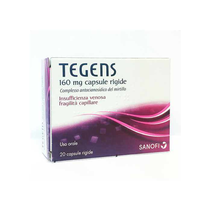 TEGENS 160 mg capsule rigide: Ogni capsula contiene: Principio attivo: complesso antocianosidico del mirtillo al 36% di antocianosidi (Myrtocyan) 160 mg. TEGENS 160 mg granulato per soluzione orale: Ogni bustina contiene: Principio attivo: complesso antocianosidico del mirtillo al 36% di antocianosidi (Myrtocyan) 160 mg. Eccipiente(i) con effetti noti: una capsula contiene 20 mg di lattosio. Una bustina contiene 15 mg di lattosio. Per l’elenco completo degli eccipienti, vedere paragrafo 6.1.